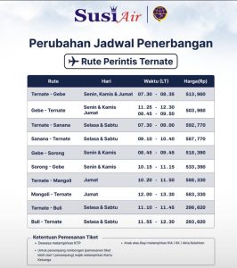 AyoTernate.com – Terjadi perubahan jadwal penerbangan pesawat Susi Air di beberapa bandara yang ada di kabupaten kota di Provinsi Maluku Utara.